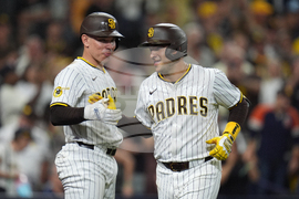 San Diego Padres' Luis Arraez, center, celebrates with Xander Bogaerts (2) after hitting a two-run home run during the second inning of a baseball game against the Milwaukee Brewers Tuesday, Sept. 23, 2025, in San Diego. (AP Photo/Gregory Bull)