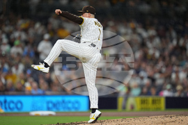 San Diego Padres relief pitcher Yuki Matsui works against a Milwaukee Brewers batter during the ninth inning of a baseball game Tuesday, Sept. 23, 2025, in San Diego. (AP Photo/Gregory Bull)