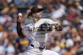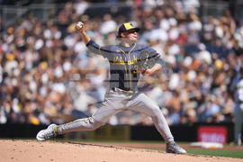 San Diego Padres starting pitcher Randy Vasquez works against a Milwaukee Brewers batter during the first inning of a baseball game Tuesday, Sept. 23, 2025, in San Diego. (AP Photo/Gregory Bull)