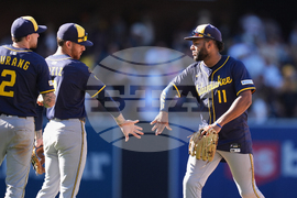 Milwaukee Brewers center fielder Jackson Chourio (11) celebrates with teammates shortstop Joey Ortiz, center, and second baseman Brice Turang after the Brewers defeated the San Diego Padres 3-1 in a baseball game Wednesday, Sept. 24, 2025, in San Diego. (AP Photo/Gregory Bull)
