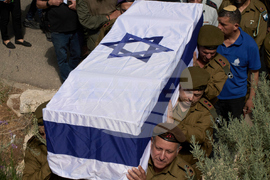 FILE - Israeli soldiers carry the coffin of Lieutenant Colonel Yitzhak Harush, who was killed in a shooting attack yesterday at the Allenby Bridge Crossing between the West Bank and Jordan, during his funeral at the Mount Herzl military cemetery in Jerusalem, Friday, Sept. 19, 2025. (AP Photo/Leo Correa)