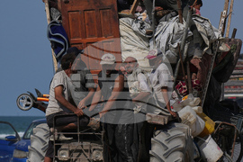 FILE - Displaced Palestinians flee northern Gaza Strip on top of a vehicle carrying their belongings along the coastal road near Wadi Gaza, Monday, Sept. 22, 2025. (AP Photo/Abdel Kareem Hana)