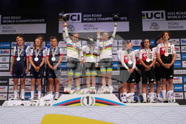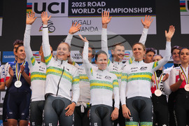 Team Australia poses on the podium after winning the team time trial mixed relay event, at the road cycling World Championships in Kigali, Rwanda, Wednesday, Sept. 24, 2025. (AP Photo/Jerome Delay)