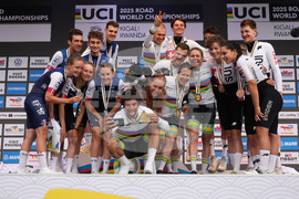 Team Australia, center, winner of the team time trial mixed relay event, poses on the podium with second placed Team France, left, and third placed Team Switzerland, at the road cycling World Championships in Kigali, Rwanda, Wednesday, Sept. 24, 2025. (AP Photo/Jerome Delay)