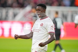 FC Midtjylland's Ousmane Diao, center, celebrates scoring with teammates during the Europa League soccer match between FC Midtjylland and SK Sturm Graz at the MCH Arena in Herning, Denmark, Wednesday Sept. 24, 2025. (Bo Amstrup/Ritzau Scanpix via AP)