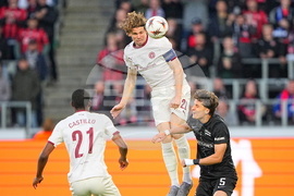 FC Midtjylland's Mads Bech Sorensen, center, and Sturm Graz's Tim Oermann in action during the Europa League soccer match between FC Midtjylland and SK Sturm Graz at the MCH Arena in Herning, Denmark, Wednesday Sept. 24, 2025. (Bo Amstrup/Ritzau Scanpix via AP)