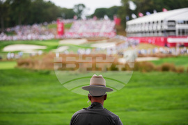 A New York state trooper watches on the 15th hole during a practice round for the Ryder Cup golf tournament, Wednesday, Sept. 24, 2025, on the Bethpage Black golf course, in Farmingdale, N.Y. (AP Photo/Matt Slocum)