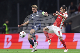 Braga's Ricardo Horta vies for the ball with Feyenoord's Goncalo Borges, left, during the Europa League opening phase soccer match between SC Braga and Feyenoord at the Municipal stadium in Braga, Portugal, Wednesday, Sept. 24, 2025. (AP Photo/Miguel Angelo Pereira)