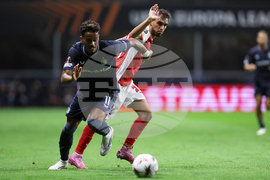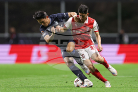 Braga's Fran Navarro fights for the ball with Feyenoord's Tsuyoshi Watanabe during the Europa League opening phase soccer match between SC Braga and Feyenoord at the Municipal stadium in Braga, Portugal, Wednesday, Sept. 24, 2025. (AP Photo/Miguel Angelo Pereira)
