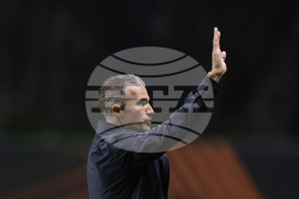 Braga's head coach Carlos Vicens gestures during the Europa League opening phase soccer match between SC Braga and Feyenoord at the Municipal stadium in Braga, Portugal, Wednesday, Sept. 24, 2025. (AP Photo/Miguel Angelo Pereira)