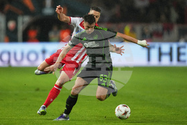 Celtic's Kieran Tierney, right, challenges for the ball with Red Star's Bruno Duarte during the Europa League soccer match between Red Star and Celtic at the Rajko Mitic Stadium in Belgrade, Serbia, Wednesday, Sept. 24, 2025. (AP Photo/Darko Vojinovic)