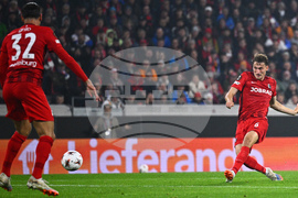 Freiburg's Patrick Osterhage scores their side's first goal of the game during the Europa League soccer match between SC Freiburg and FC Basel at the Europa-Park Stadium in Freiburg Im Breisgau, Germany, Wednesday, Sept. 24, 2025. (Tom Weller/dpa via AP)