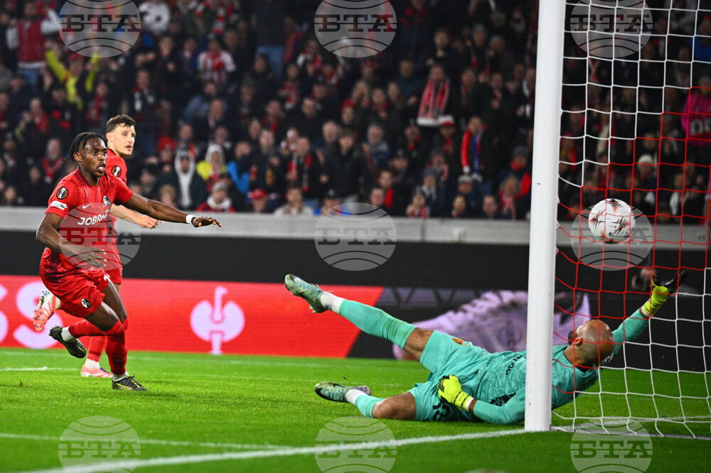 Basel's goalkeeper Mirko Salvi, right, looks on as Freiburg's players celebrate their side's second goal of the game during the Europa League soccer match between SC Freiburg and FC Basel at the Europa-Park Stadium in Freiburg Im Breisgau, Germany, Wednesday, Sept. 24, 2025. (Tom Weller/dpa via AP)