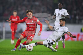 Freiburg's Johan Manzambi, left, and Basel's Leo Lerdy fight for the ball during the Europa League soccer match between SC Freiburg and FC Basel at the Europa-Park Stadium in Freiburg Im Breisgau, Germany, Wednesday, Sept. 24, 2025. (Tom Weller/dpa via AP)