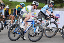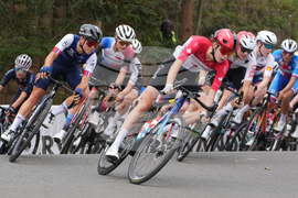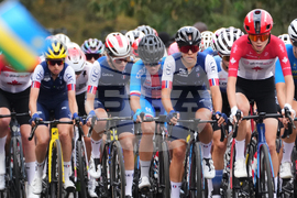 United States' Mia Aseltine, foreground, pedals in the pack during the women's Under 23 race, at the road cycling World Championships in Kigali, Rwanda, Thursday, Sept. 25, 2025. (AP Photo/Jerome Delay)