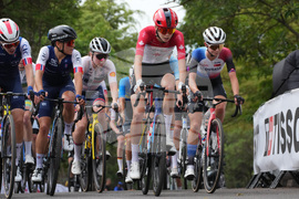 Canada's Isabella Holmgren, foreground, leads the pack during the women's Under 23 race, at the road cycling World Championships in Kigali, Rwanda, Thursday, Sept. 25, 2025. (AP Photo/Jerome Delay)