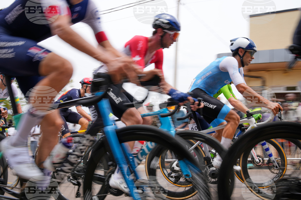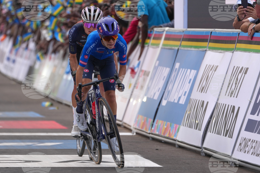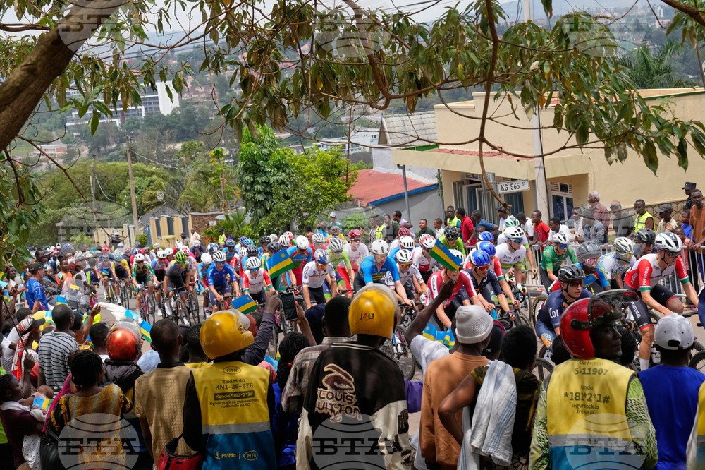 Riders pedal during the men's Under 23 road race, at the road cycling World Championships in Kigali, Rwanda, Friday, Sept. 26, 2025. (AP Photo/Jerome Delay)