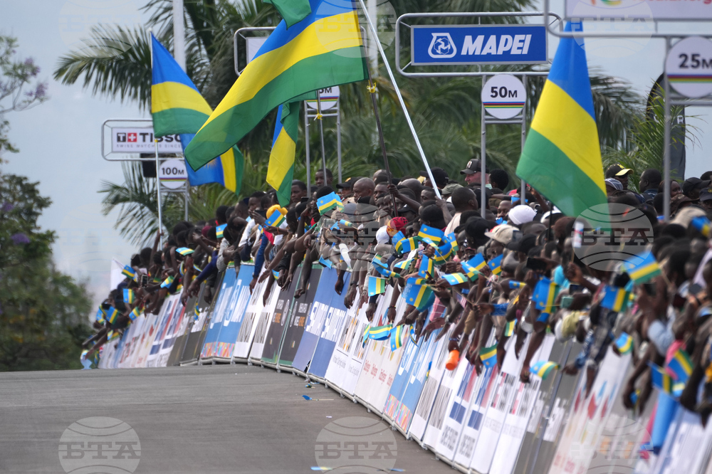 Spectators wait for the cyclists to pass by during the women's Under 23 race, at the road cycling World Championships in Kigali, Rwanda, Thursday, Sept. 25, 2025. (AP Photo/Jerome Delay)