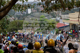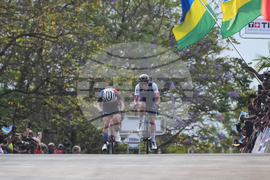 Spectators watch Colombia's Juliana Londono David, right, and Alena Ivanchenko, during the women's Under 23 race, at the road cycling World Championships in Kigali, Rwanda, Thursday, Sept. 25, 2025. (AP Photo/Jerome Delay)