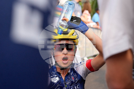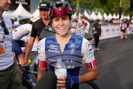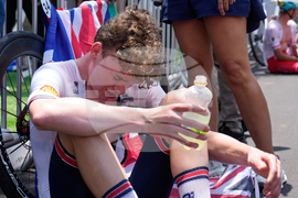 France's Marion Bunel cools off after completing the women's Under 23 race, at the road cycling World Championships in Kigali, Rwanda, Thursday, Sept. 25, 2025. (AP Photo/Jerome Delay)