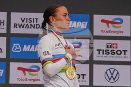 France's Celia Gery listens to the national anthem on the podium after winning the gold medal of the women's Under 23 race, at the road cycling World Championships in Kigali, Rwanda, Thursday, Sept. 25, 2025. (AP Photo/Jerome Delay)