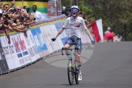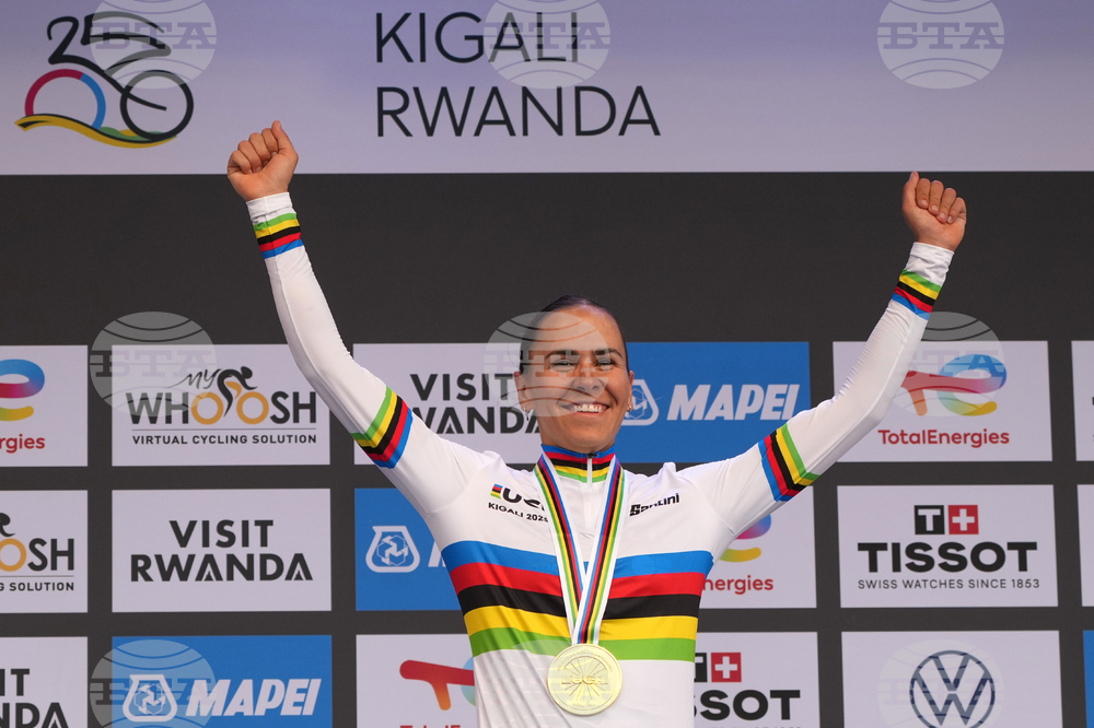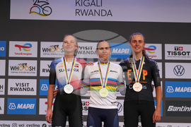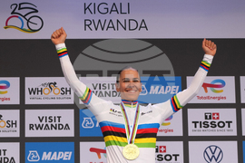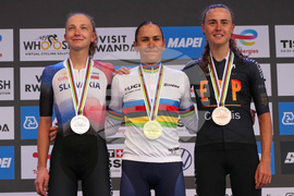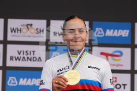 Slovakia's Viktoria Chladonova shot her silver medal of the women's Under 23 race, at the road cycling World Championships in Kigali, Rwanda, Thursday, Sept. 25, 2025. (AP Photo/Jerome Delay)
