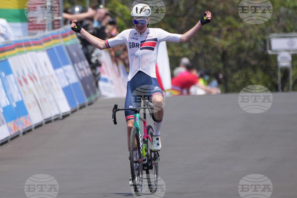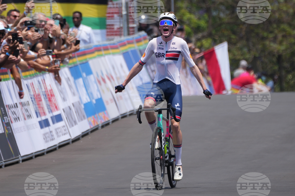 Britain's Harry Hudson reacts after winning the men's Junior road race, at the road cycling World Championships in Kigali, Rwanda, Friday, Sept. 26, 2025. (AP Photo/Jerome Delay)