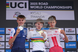 Britain's Harry Hudson, center, shows his gold medal flanked by silver medallist France's Johan Blanc, left, and bronze medallist Poland's Jan Jackowiak, during the podium ceremony for the men's Junior road race, at the road cycling World Championships in Kigali, Rwanda, Friday, Sept. 26, 2025. (AP Photo/Jerome Delay)