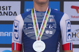 France's Johan Blanc poses with his silver medal of the men's Junior road race, at the road cycling World Championships in Kigali, Rwanda, Friday, Sept. 26, 2025. (AP Photo/Jerome Delay)