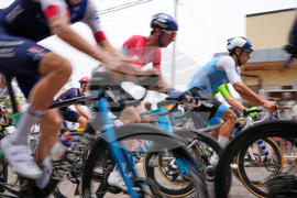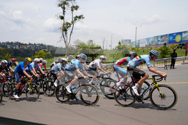 The pack of riders during the men's Under 23 road race, at the road cycling World Championships in Kigali, Rwanda, Friday, Sept. 26, 2025. (AP Photo/Jerome Delay)