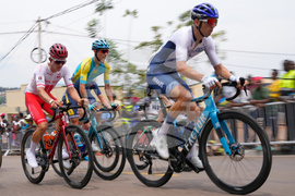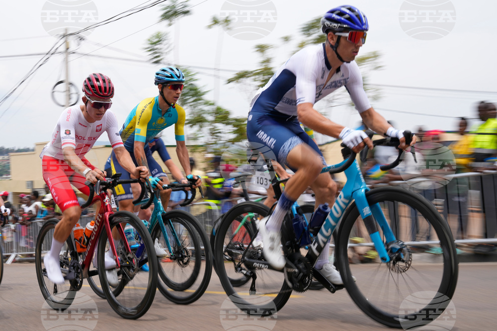Israel's Emry Faingezicht, right, pedals during the men's Under 23 road race, at the road cycling World Championships in Kigali, Rwanda, Friday, Sept. 26, 2025. (AP Photo/Jerome Delay)
