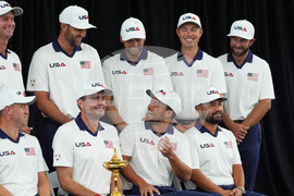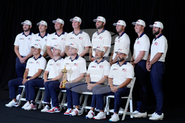 The United States poses for a team picture at the Ryder Cup golf tournament, Thursday, Sept. 25, 2025, on the Bethpage Black golf course, in Farmingdale, N.Y. (AP Photo/Robert Bukaty)