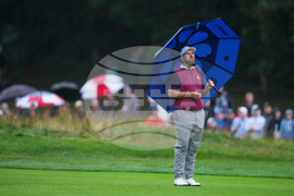 Europe's Rory McIlroy makes his way down a rain soaked hill during a practice round at the Ryder Cup golf tournament, Thursday, Sept. 25, 2025, on the Bethpage Black golf course, in Farmingdale, N.Y. (AP Photo/Seth Wenig)