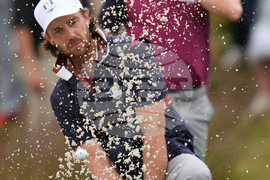 Europe's Tommy Fleetwood hits from the bunker on the fifth hole during a practice round at the Ryder Cup golf tournament, Thursday, Sept. 25, 2025, on the Bethpage Black golf course, in Farmingdale, N.Y. (AP Photo/Seth Wenig)