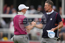 Europe's Rory McIlroy and Justin Rose shake hands on the ninth hole during a practice round at the Ryder Cup golf tournament, Thursday, Sept. 25, 2025, on the Bethpage Black golf course, in Farmingdale, N.Y. (AP Photo/Seth Wenig)