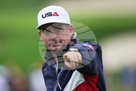 United States captain Keegan Bradley points on the 16th hole during a practice round at the Ryder Cup golf tournament, Thursday, Sept. 25, 2025, on the Bethpage Black golf course, in Farmingdale, N.Y. (AP Photo/Matt Slocum)
