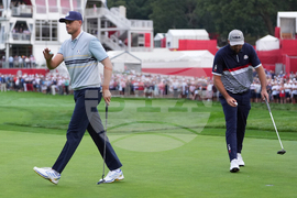 United States' Bryson DeChambeau and Justin Thomas walk on the second hole at Bethpage Black golf course during the Ryder Cup golf tournament, Friday, Sept. 26, 2025, in Farmingdale, N.Y. (AP Photo/Matt Slocum)