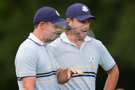 Europe's Rory McIlroy and Shane Lowry smile on the third hole during a practice round at the Ryder Cup golf tournament, Thursday, Sept. 25, 2025, on the Bethpage Black golf course, in Farmingdale, N.Y. (AP Photo/Lindsey Wasson)