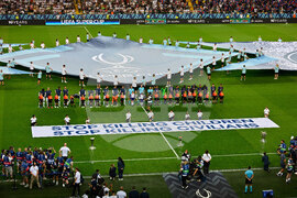FILE - The players line up before the UEFA Super Cup soccer match between Paris Saint-Germain and Tottenham Hotspur in Udine, Italy, Wednesday, Aug. 13, 2025. (AP Photo/Denes Erdos, File)