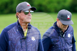 FILE - Phil Mickelson and Zack Johnson watch on the second hole during a practice day at the Ryder Cup golf matches at the Whistling Straits Golf Course, Tuesday, Sept. 21, 2021, in Sheboygan, Wis. (AP Photo/Charlie Neibergall, File)