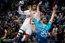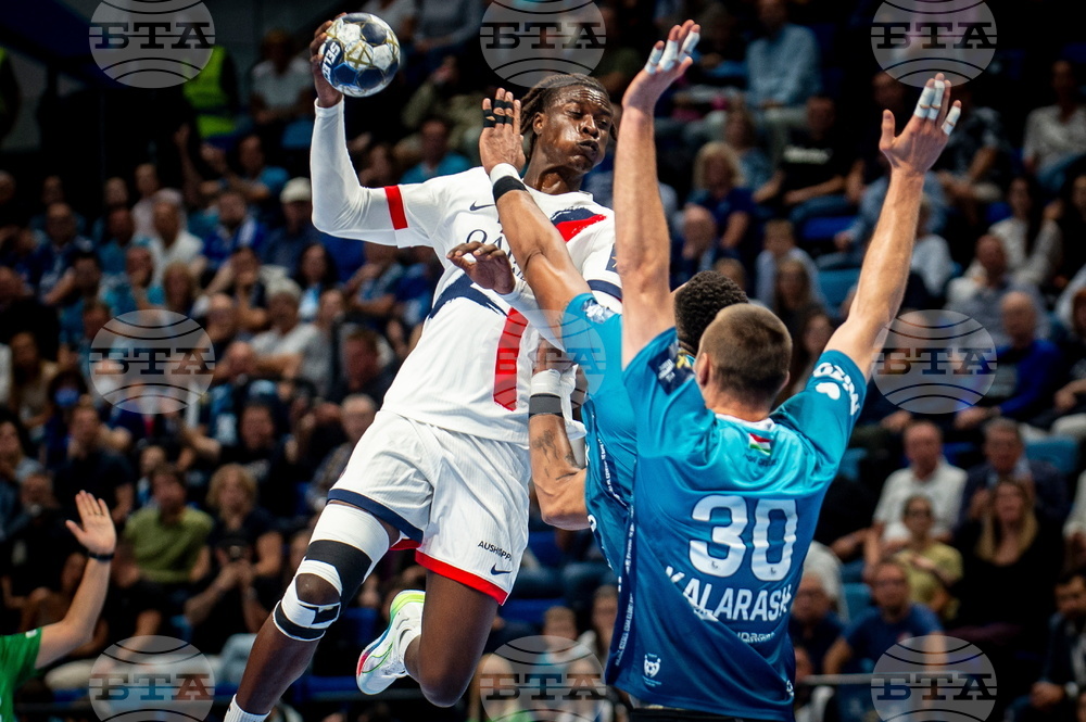 Wallem-Konrad Peleka, left, of Paris Saint-Germain throws the ball past Gleb Kalarash of Szeged during the men's handball Champions' League Group B third round match between OTP Bank-Pick Szeged and Paris Saint-Germain in Szeged, Hungary, Thursday, Sept. 25, 2025. (Sandor Ujvari/MTI via AP)