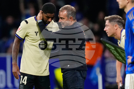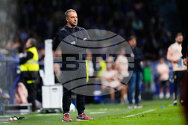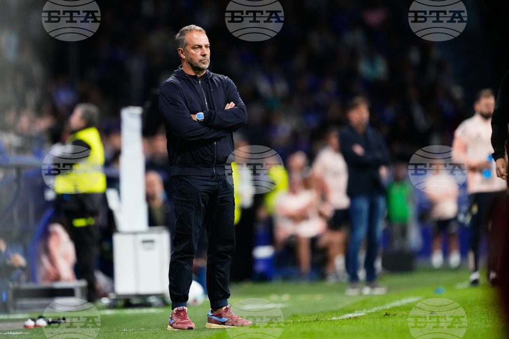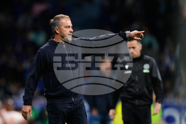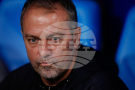 Barcelona's head coach Hansi Flick during a Spanish La Liga soccer match at the Carlos Tartiere stadium in Oviedo, Spain, Thursday, Sept. 25, 2025. (AP Photo/Jose Breton)