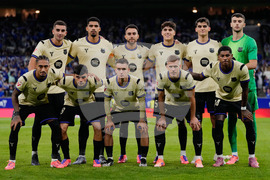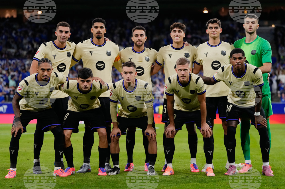 Barcelona players pose for a photo during a Spanish La Liga soccer match at the Carlos Tartiere stadium in Oviedo, Spain, Thursday, Sept. 25, 2025. (AP Photo/Jose Breton)