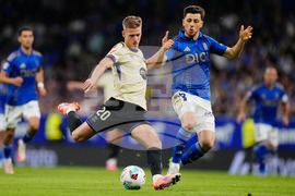 Barcelona's Frenkie de Jong fights for the ball against Real Oviedo's Salomon Rondon for the ball during a Spanish La Liga soccer match at the Carlos Tartiere stadium in Oviedo, Spain, Thursday, Sept. 25, 2025. (AP Photo/Jose Breton)