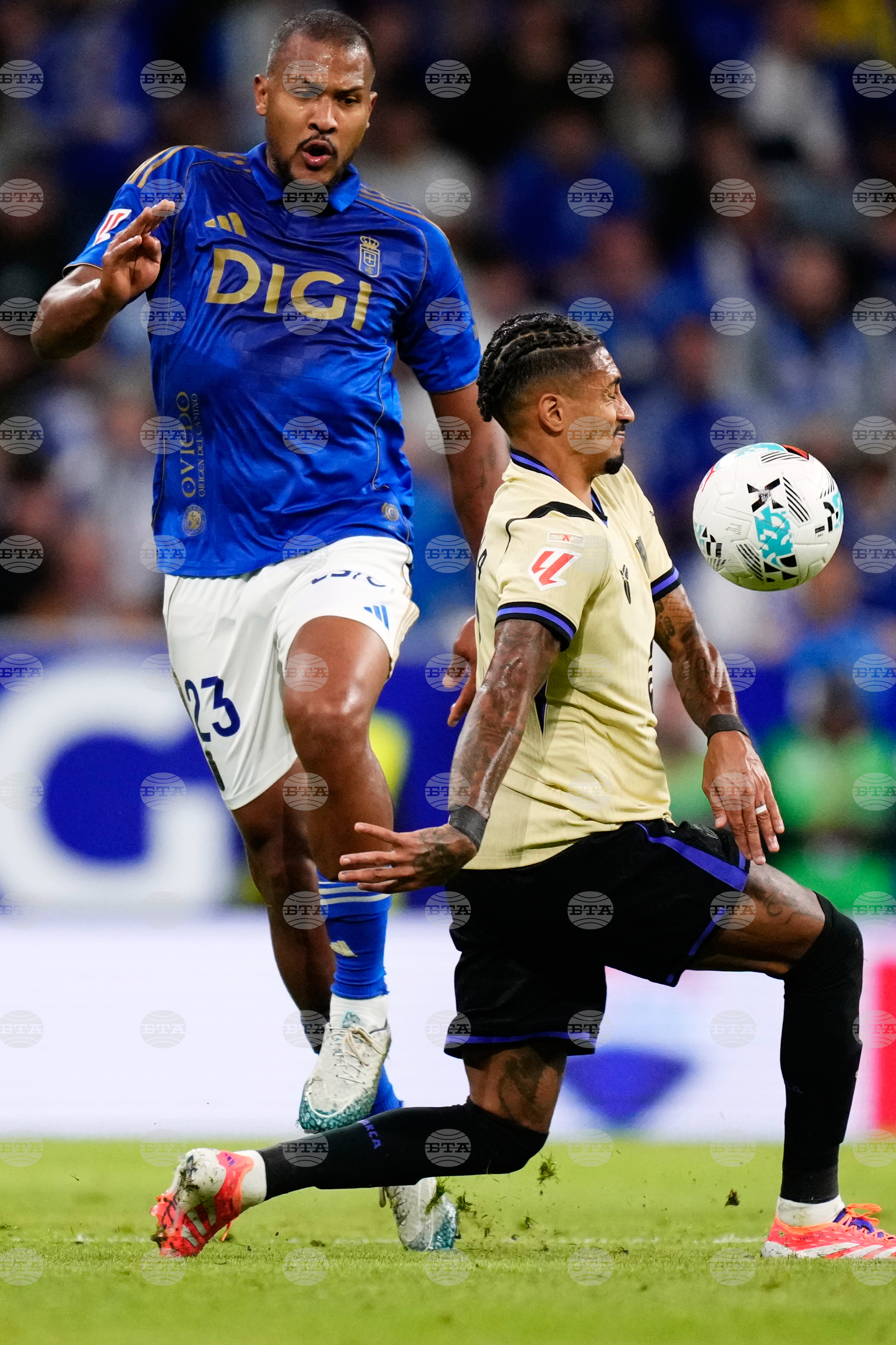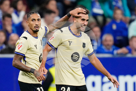 Barcelona's Gerard Martin fights for the ball against Real Oviedo's Leander Dendoncker during a Spanish La Liga soccer match at the Carlos Tartiere stadium in Oviedo, Spain, Thursday, Sept. 25, 2025. (AP Photo/Jose Breton)