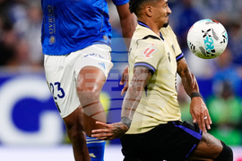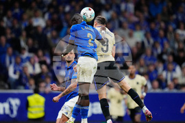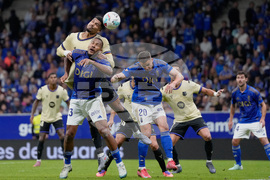 Barcelona's Ronald Araujo jumps for the ball against Real Oviedo's Salomon Rondon during a Spanish La Liga soccer match at the Carlos Tartiere stadium in Oviedo, Spain, Thursday, Sept. 25, 2025. (AP Photo/Jose Breton)