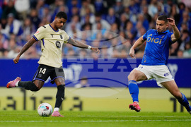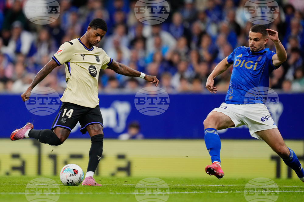 Barcelona's Marcus Rashford fights for the ball against Real Oviedo's Rahim Alhassane during a Spanish La Liga soccer match at the Carlos Tartiere stadium in Oviedo, Spain, Thursday, Sept. 25, 2025. (AP Photo/Jose Breton)