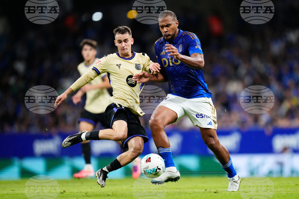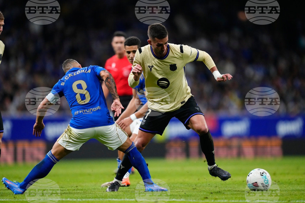 Barcelona's Dani Olmo fights for the ball against Real Oviedo's Alberto Reina during a Spanish La Liga soccer match at the Carlos Tartiere stadium in Oviedo, Spain, Thursday, Sept. 25, 2025. (AP Photo/Jose Breton)