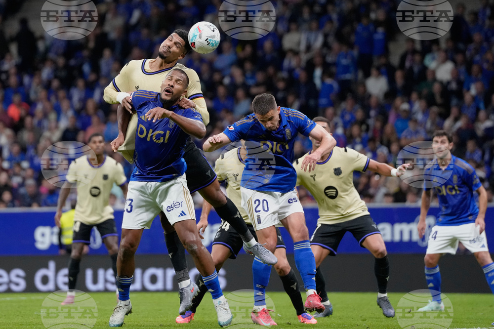 Barcelona's Robert Lewandowski fights for the ball against Real Oviedo's Federico Vinas during a Spanish La Liga soccer match at the Carlos Tartiere stadium in Oviedo, Spain, Thursday, Sept. 25, 2025. (AP Photo/Jose Breton)