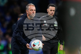 Barcelona's head coach Hansi Flick holds the ball during a Spanish La Liga soccer match at the Carlos Tartiere stadium in Oviedo, Spain, Thursday, Sept. 25, 2025. (AP Photo/Jose Breton)